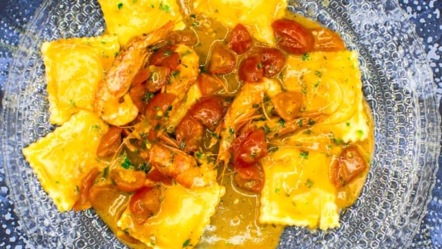 Catalana di crostacei servita con salsa tzatziki - scampi* e gambero rosso