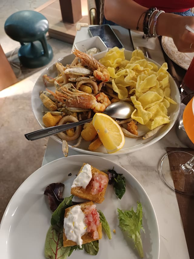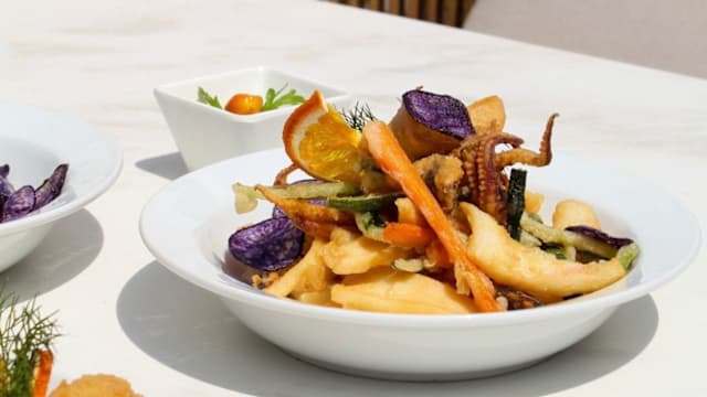 Frittura di mare con anelli di calamaro, gamberi e piccoli pesci di paranza, servita con croccanti verdure pastellate e salsa tartara.