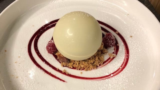 Sorbetto ai lamponi, olio alla menta e lamponi crispy.