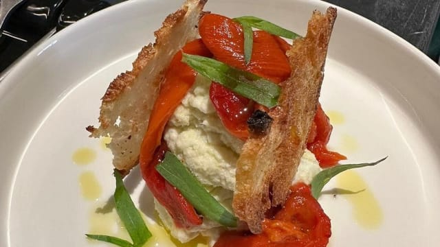 Stracciatella e acciughe del cantabrico stracciatella, tartare di gambero e bottarga di tonno