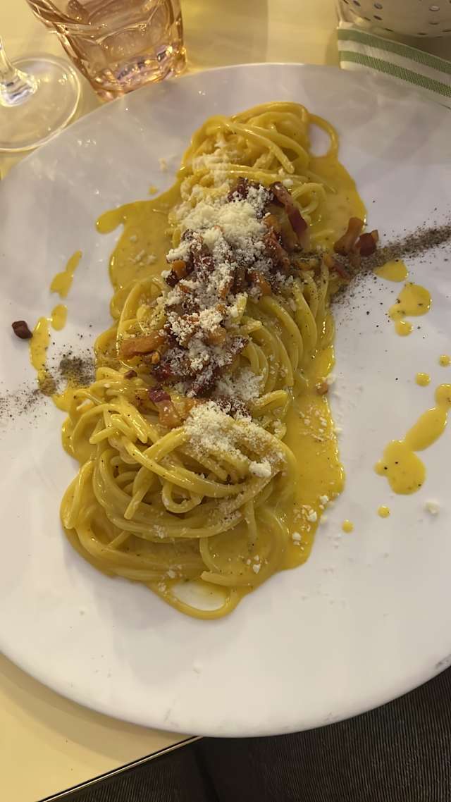 Carbonara di spaghetti artigianali pastificio mancini con uova paolo parisi e guanciale croccante