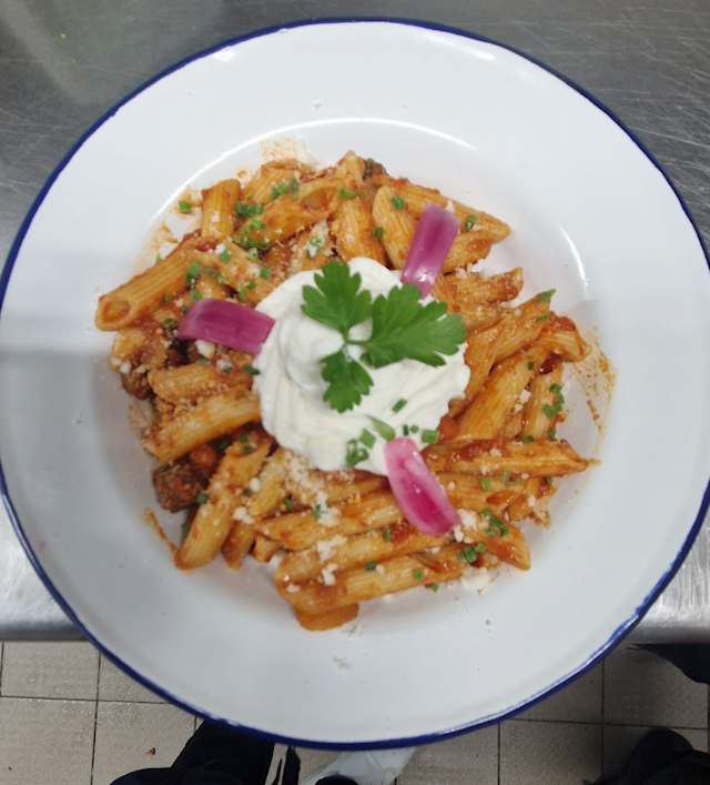 - Sauce tomate aux poivrons, boeuf haché, fêta émiettée, pois chiches rôtis, pickles et oeuf poché