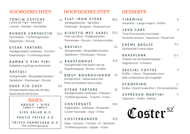 Coster 52° is een echt Haarlems eetcafé waar gastvrijheid en kwaliteit hoog in het vaandel staan. Naast het heerlijke drankje en/of hapje, wat er bij Coster 52° genuttigd kan worden, kan ook kennis worden opgedaan over de geschiedenis van Haarlem. Zo is de naam Coster 52° afkomstig van Laurens Jansz...