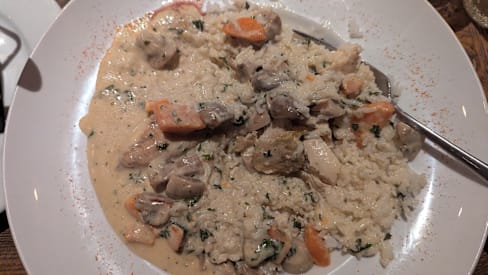 8/10The tall guy that serves is soooo awesome and he makes your day!! Risotto with shrimps, perfect flavor, so overcooked shrimps tho, try to cook them less they were hard as rocks. The guy that is in the bar, please don't cut the bread with hands without gloves after touching cocktails, money, and everything. Overall good experience. Atmosphere cozy.