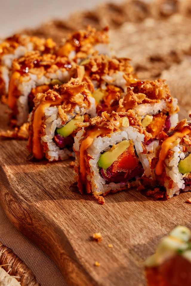 - Intérieur: crevette panée au panko, concombre extérieur : thon, épices japonaises (shichimi), ciboulette, chips de feuille de blé