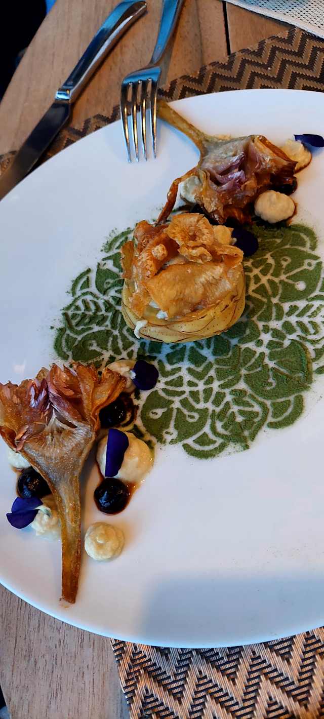 - Déclinaison d’artichauts à l’ail noir et poudre d’épinards