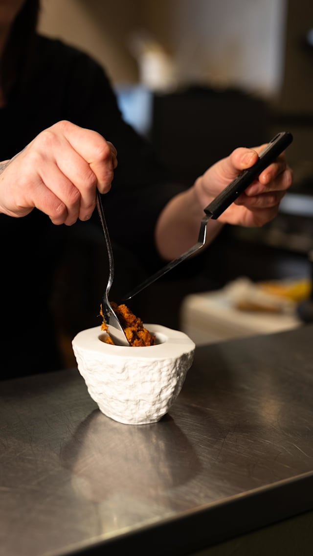 - Tubérculos con mahonesa de kimchee y polvo de aceituna negra