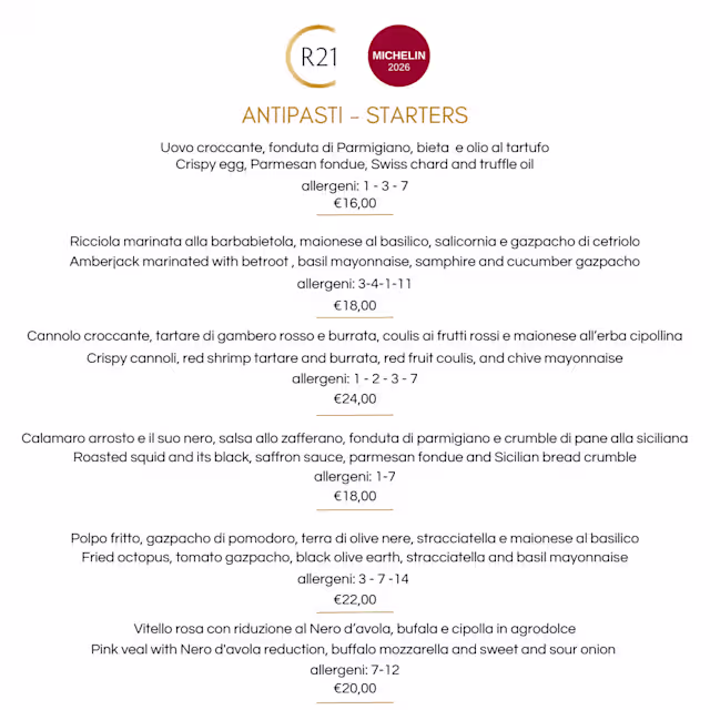 CR21 is a high-quality fusion restaurant rooted in Sicilian tradition. The starters featuring raw fish and the gnocchi with red shrimp tartare were excellent. However, the main course—cod with sfincione sauce, Ragusano fondue, and toasted breadcrumbs—proved to be slightly flat. The service is faultless, and the ambiance is very pleasant. Highly recommended.