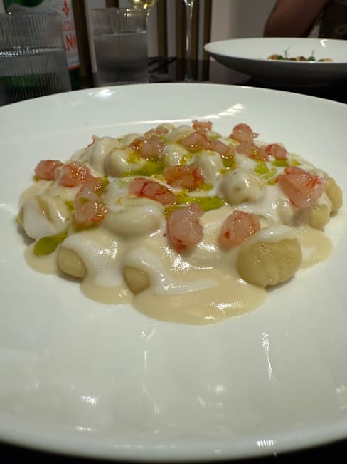 7.5/10Fabulous amuse bouche, with a marinated mushroom, Good starters fair main seafood dishes, seemed to us like modernized Palermo cuisine. Also a decent wine menu. Service was friendly and forthcoming but needs better training / education in its field. Ambiente is very modern and sleek, but suffered by the fact that it is the breakfast room for the attached suite hotel which felt more like a canteen.