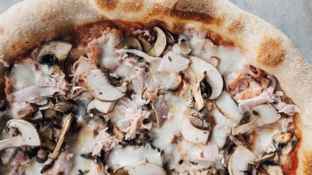 Tomàquet, mozzarella fior di latte, pernil dolç i xampinyons.