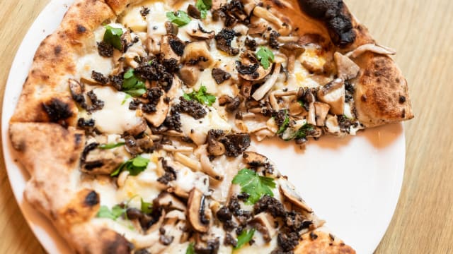 Mozzarella fior di latte, bolets, tòfona, provolone padana (piemonte), julivert i pebre negre.