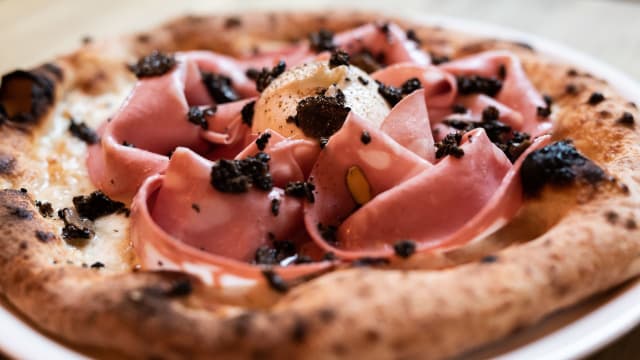 Mozzarella fior di latte, mortadella di bologna, tòfona, burrata i pebre negre.