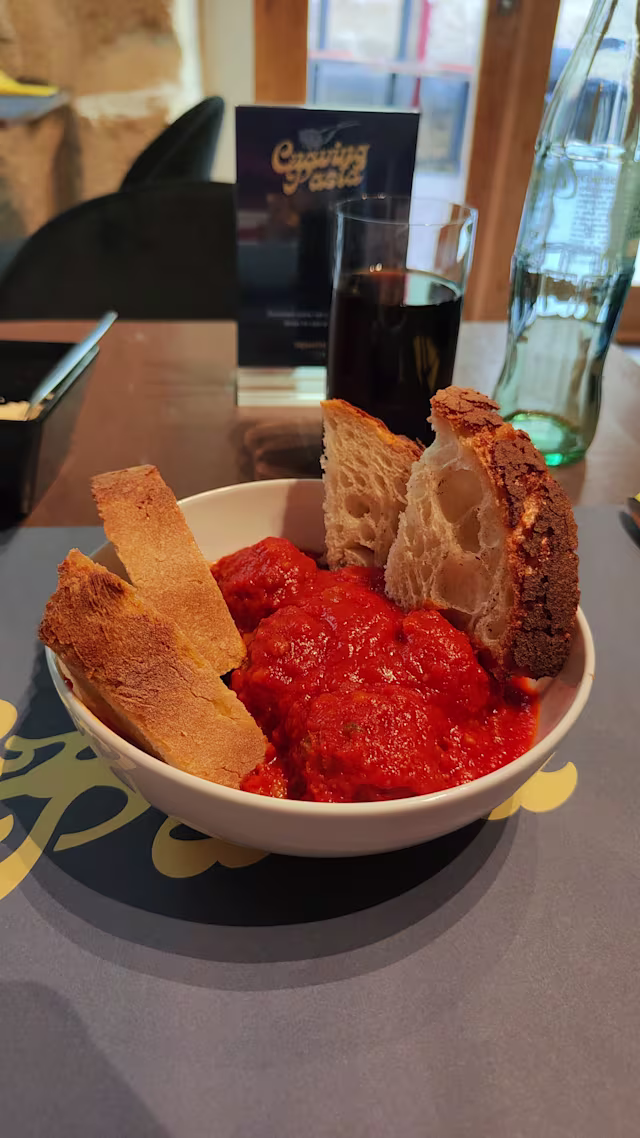 - Albóndigas de ternera con salsa de tomate y pan crujiente.