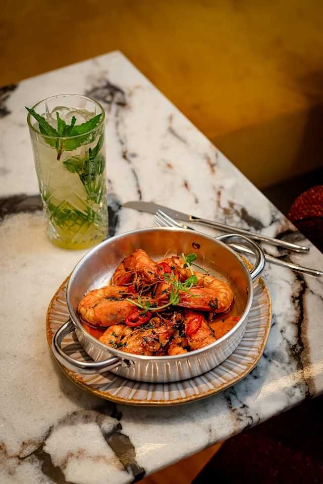 Gambas salteadas em alho, malagueta, temperados com coentros picados e raspas de limão.