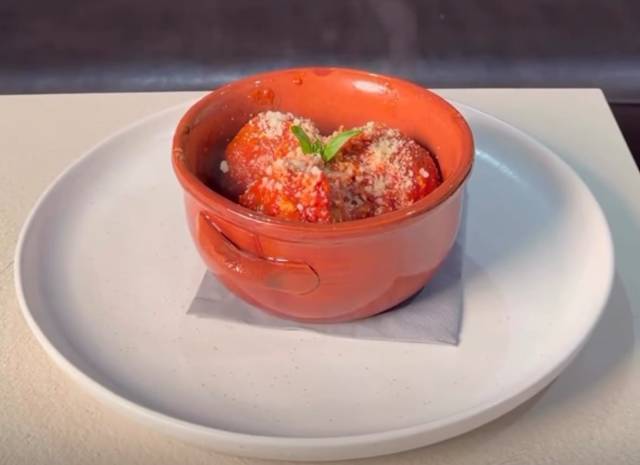 - Fiordilatte, pomodoro, polpettine fritte, grana grattugiato in uscita, basilico e olio EVO.