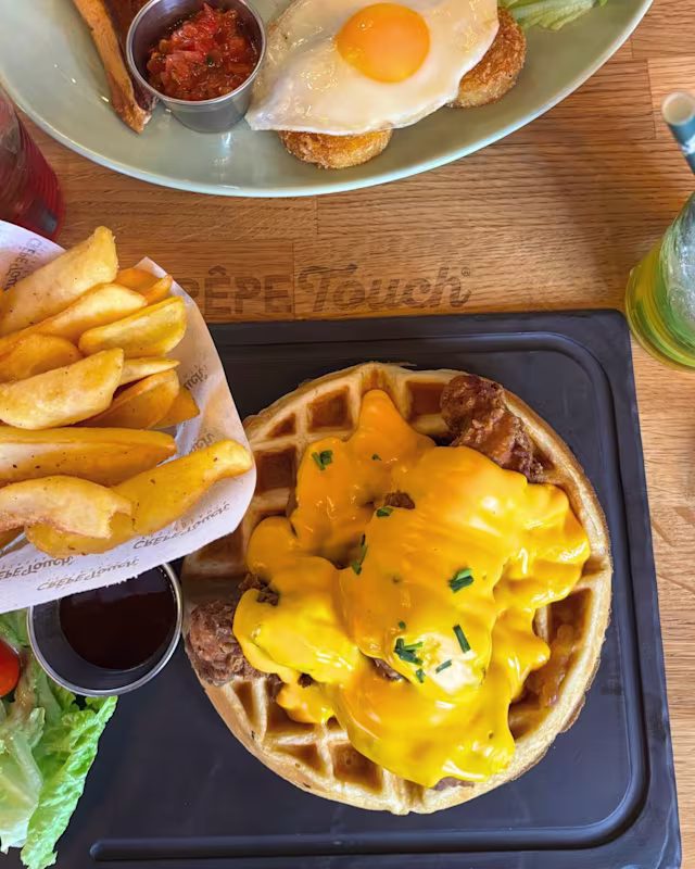 - Lardons fumés ou poulet” à La crème, pommes de terre vapeur, fromage raclette, oignons caramélisés, Le tout sur gaufre toastée, sauce mayonnaise, french fries dorées, salade fraîche et croquante