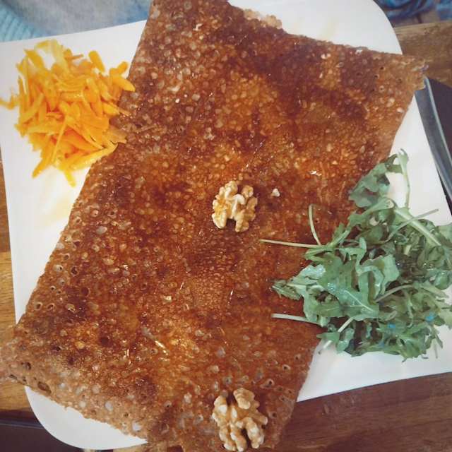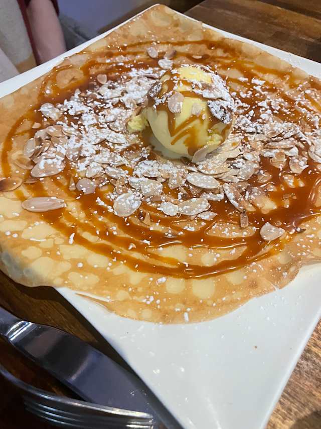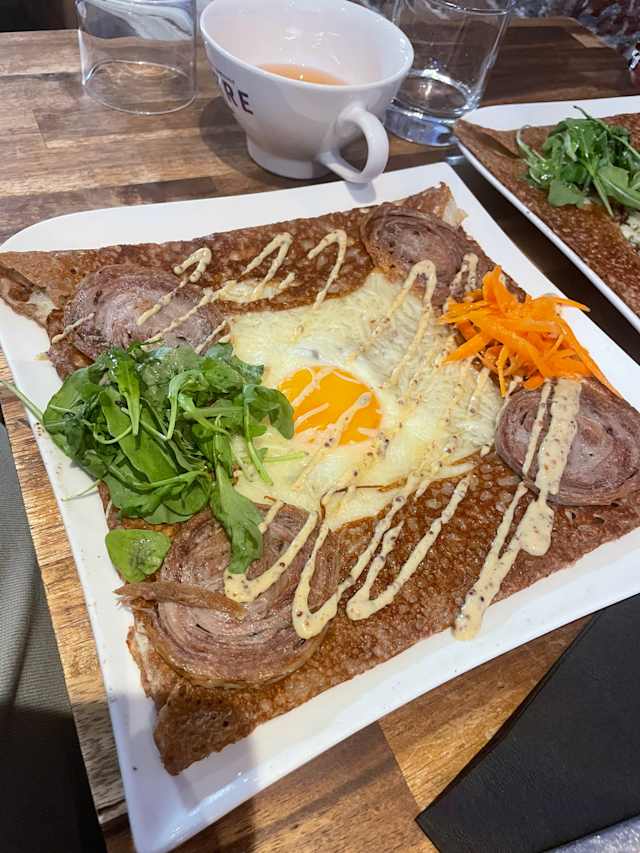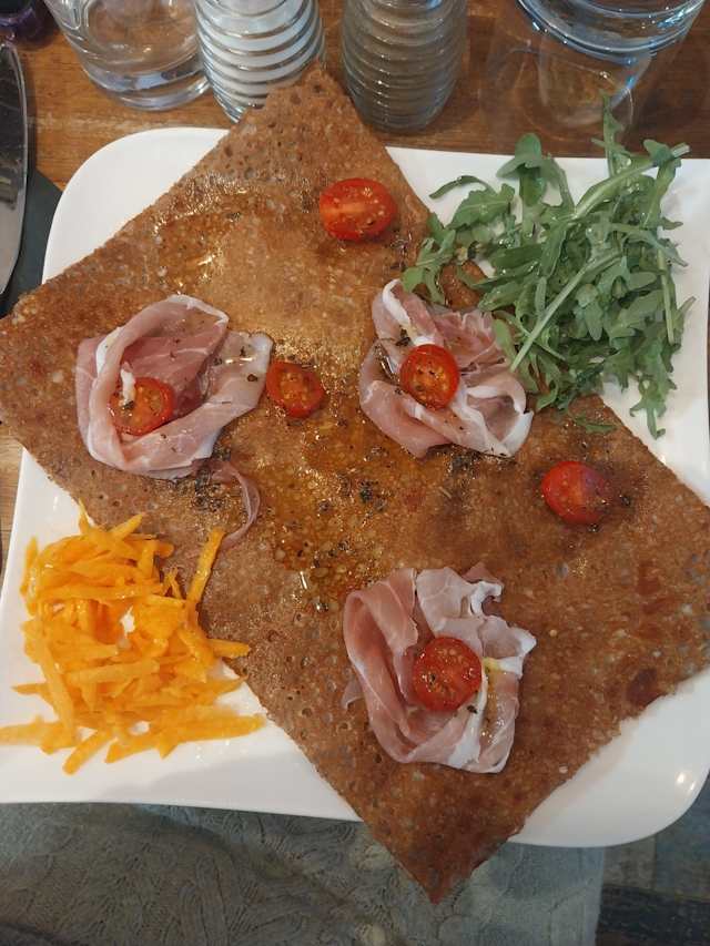 5.5/10This is a very small diner like cafe. Not much English speaking but polite owner. Quality ingredients, but truly nothing like what I expected after 5 star reivews - especially compared to Breitz crepes - who were more rude but a true restaurant, with ambience, salads, craft cider, and many many choices for savory crepes.