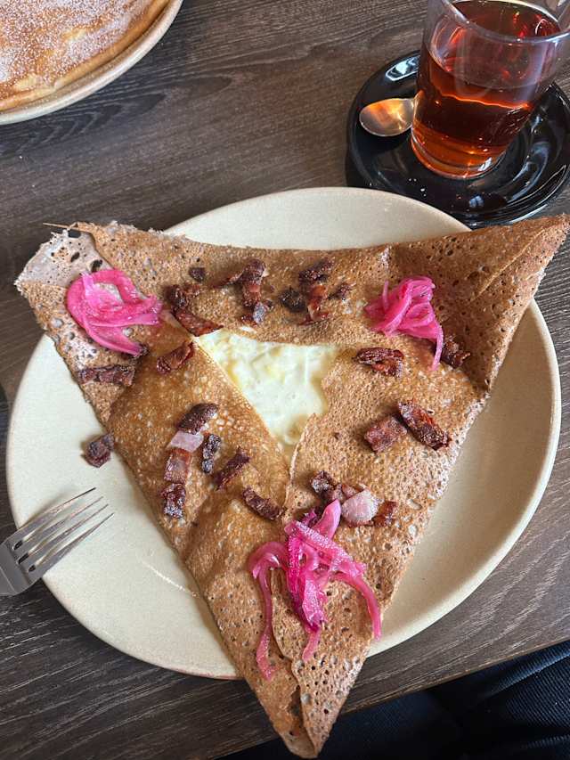 - Gruyère AOP, œuf, oignons confits au cidre, lardons, crème acidulée