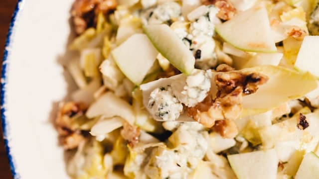 - Pousses d’épinards, bûche de chèvre, pommes caramélisées, miel, cerneaux de noix