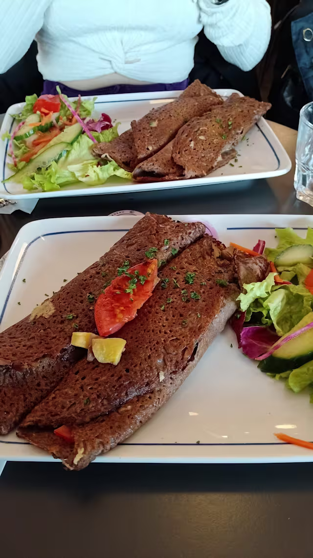 - À la farine de sarrasin, servies avec salade