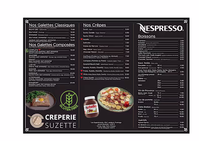 ⭐⭐⭐⭐⭐ Excellent stop in Nice! We had a fantastic lunch at Crêperie Suzette yesterday. I highly recommend the Galette Complète, which was perfectly cooked, and my wife loved her Galette Chèvre. The service was incredibly fast, which we really appreciated, and our waiter was exceptionally kind and polite. Everything was delicious and fresh. A must-visit if you're in the area!