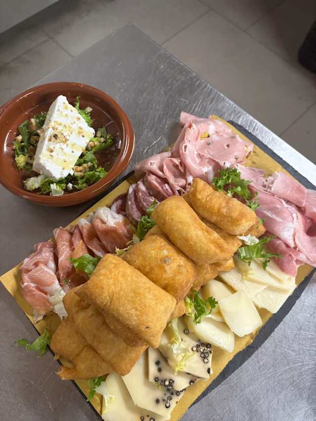 - Prosciutto cotto, crudo di parma 18 mesi, mortadella di bologna igp, salame sant’angelo, grana, primo sale, formaggio al pistacchio, ricotta fresca. Il tutto servito con pasta fritta.