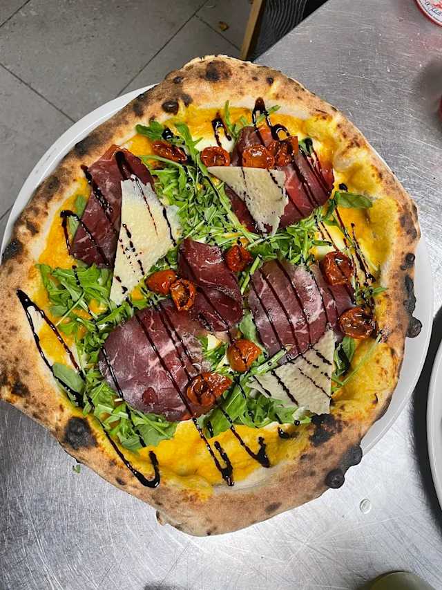 - Salsa san marzano, mozzarella fior di latte, funghi freschi, crudo di parma 18 mesi, scaglie, semi-dry rosso, olio e basilico.