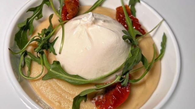 - Polpo alla piastra su crerma di fave, burratina fresca e pomodorino confit