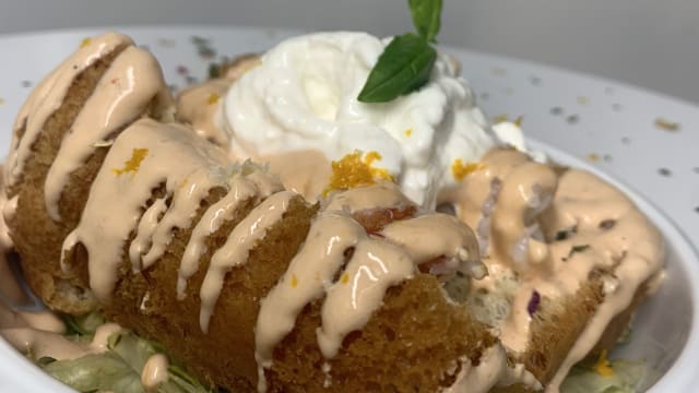 - Baccalà pastellato e fritto, su hummus di ceci e salsa tajina (a base di semi di sesamo)