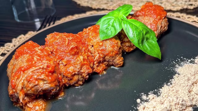 - Braciole di manzo a cottura lenta in salsa di pomodoro, servite con farinella a parte. (3 pz)
