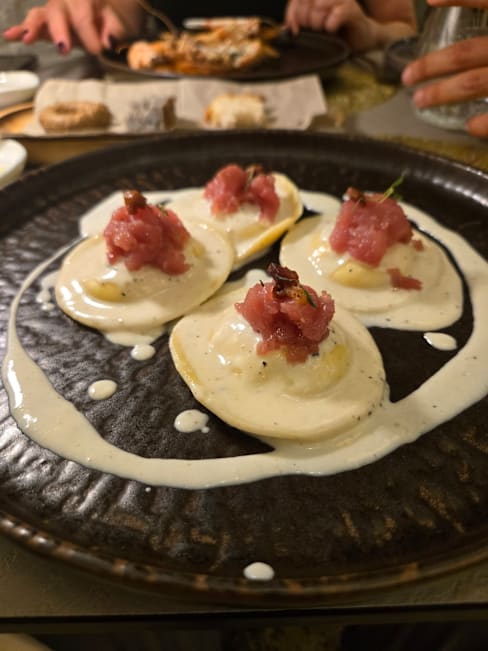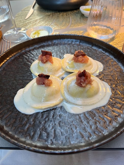 8.5/10very nice restaurant with fish based menu. the scallops were our favorite appetizer and the tuna ravioli was very good. apart from the pasta the portions focused on presentation more so than quantity. the service was very good and the atmosphere was nice albeit we ate outside in the alley.