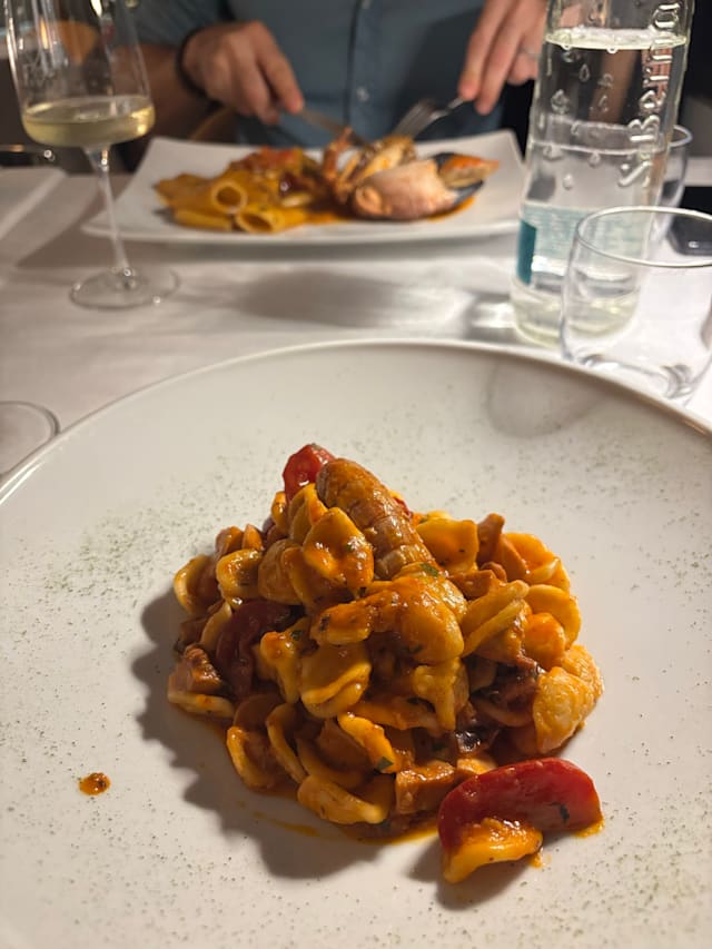 8.5/10We had a great evening at this restaurant. My husband and I chose a dish from the regular menu. The secondi with fish was perfect, the pasta with shrimp was already a bit cold, which was a pity. Overall good experience and aid we come back we would choose one of the seafood platters, that are very popular in this restaurant. They looked good.