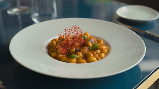 Gnocchetti allo zafferano, gambero rosso in doppia consistenza e zeste di lime