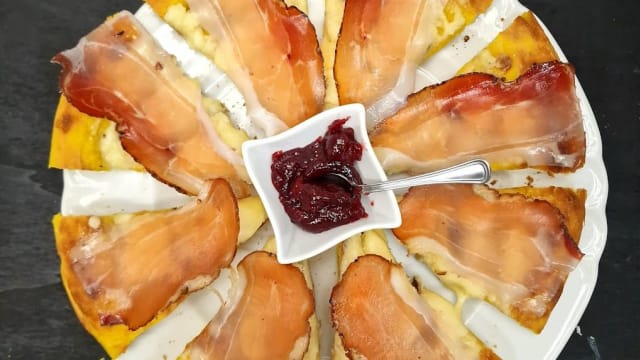 Speck riserva, patate cremose al parmigiano, raschera. Le patate sono cotte lentamente e mantecate con stracchino e raschera. In uscita: lo speck più pregiato dell’agrimacelleria caldera di asti