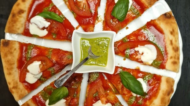 La nostra versione contemporanea della margherita: stracciatella cremosa, pomodorini marinati, passata di pomodoro e gocce di pesto