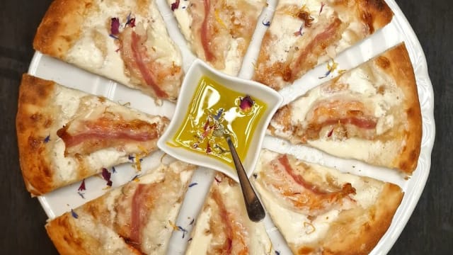 Una quattro formaggi gourmet: gorgonzola, parmigiano, stracchino e raschera, completata da radicchio e miele per un contrasto ricco e goloso