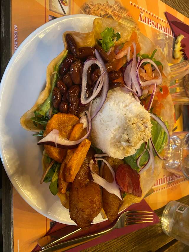 - Chausson fourré d’un mijoté de légumes croquants, boulettes de soja fondantes, mélange de fromages et de riz basmati assaisonnés à la cubaine, manioc et salade mixte