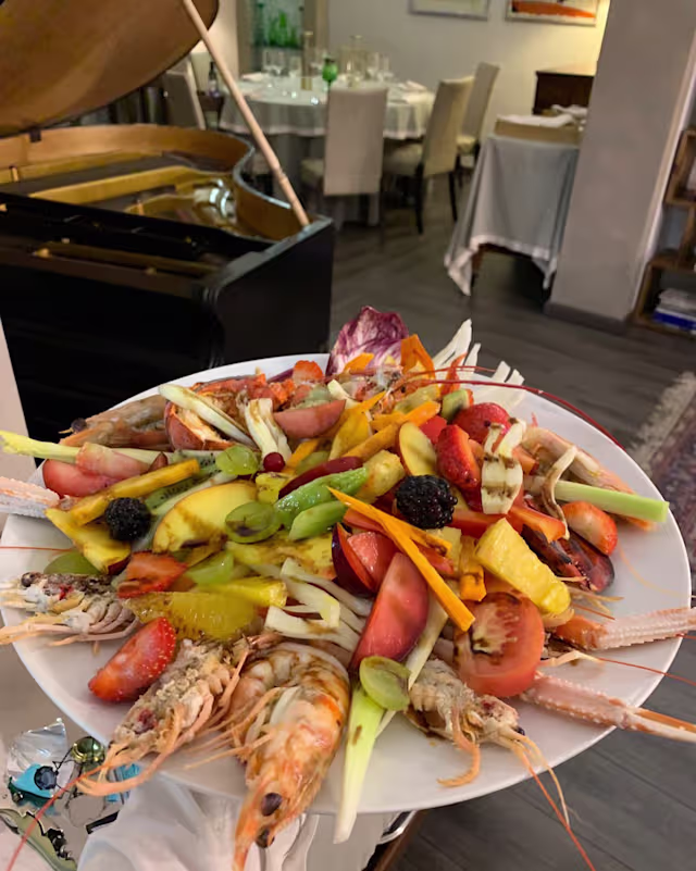 - Selezione di crudi del mediterraneo con ostriche, crostacei (scampi, mazzancolle, gamberi rossi) e carpacci di pesce (salmone marinato e cuore di capesanta), serviti con condimenti delicati che esaltano la naturale freschezza del pescato.