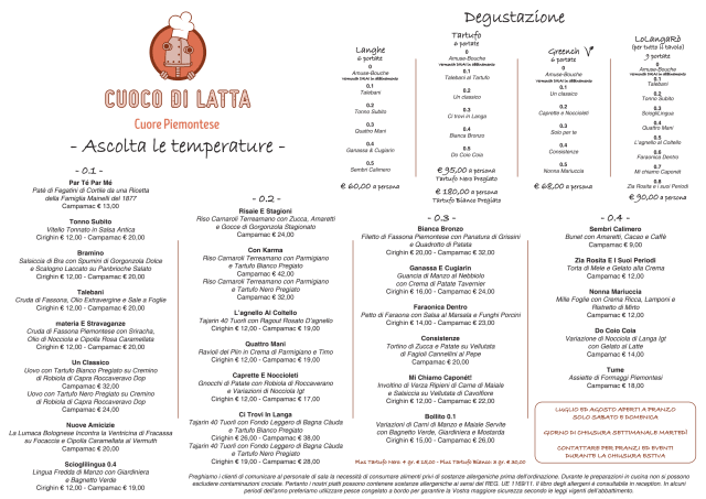 9.5/10Six of us had a lovely meal on Friday evening. We choose the Lange tasting menu. The effort from the kitchen that went into this meal was extraordinary. The amuse bouche was a delicious chicken liver pate shaped like a shell and this was followed by five more dishes exquisitely prepared. The braised lamb cheek was delectable as was the very thinly cut veal accompanied by tuna dollop that was artfully presented. The service was perfect and pleasant. Our vermemtino and barolo wines were ideal and were chosen from a very good slate of wines. I would highly recommend a visit to Cuoco do Latta!