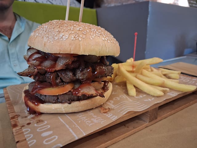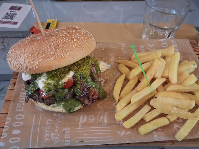 200gr piedmontese fassona hamburger, cheddar cheese, calabrian red onion, tomato, avocado, almond pesto, mayonnaise, all wrapped in iceberg leaves without bread. Accompanied by celeriac chips