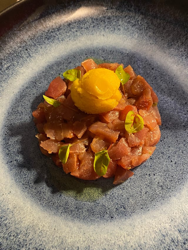 Tartare di tonno con sorbetto al lemongrass e banana alla soja