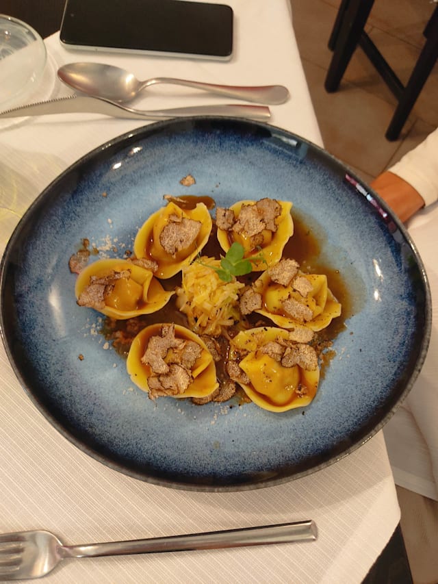 ravioli di ciavuscolo con riduzione di Sagrantino, melone invernale e pecorino romano tartufo nero