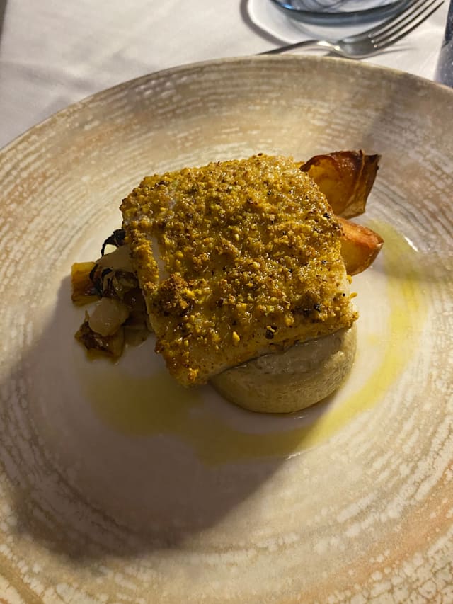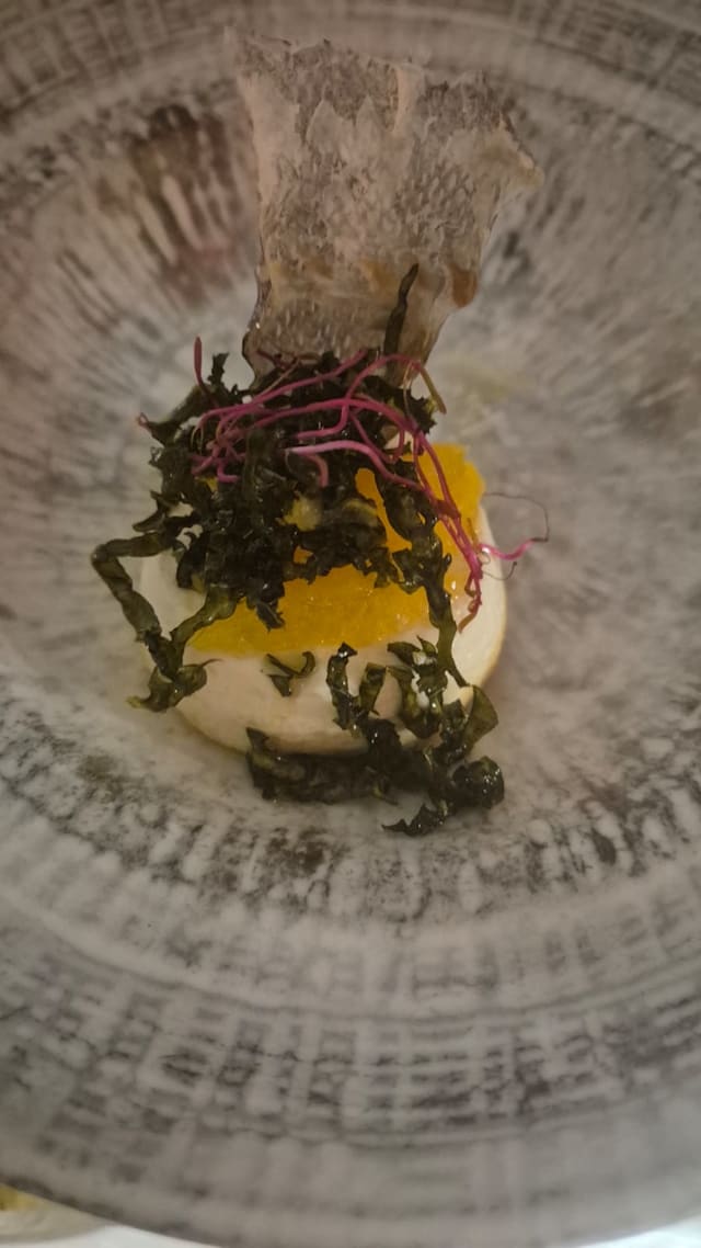 Carciofo fritto ,farcito con capesante,su crema di patate