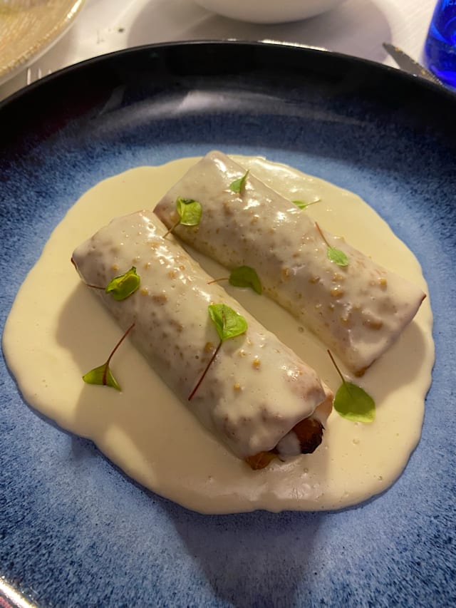 Cannelloni az.marullo gratinati con cozze e patate, salsa allo zafferano e tartufo nero pregiato