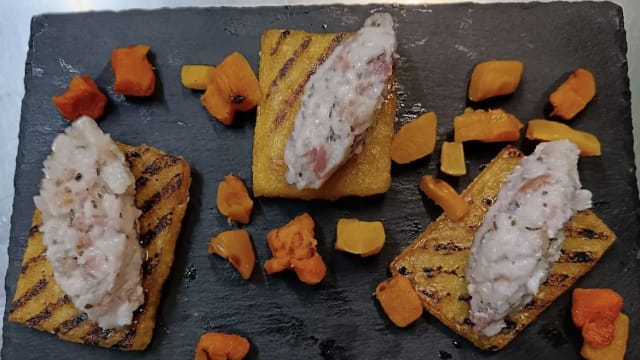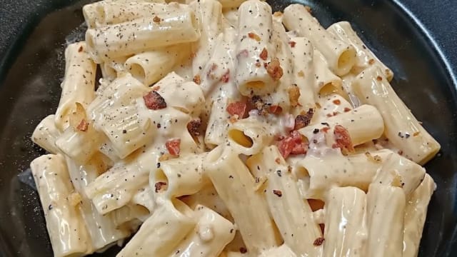 Pomodoro, mozzarella, crema di pecorino, uovo, pancetta stufata e pepe