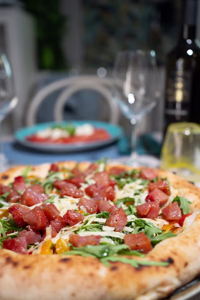 - Base turca, con pomodorini datterini rucola selvatica scaglie di grana padano e cubetti di tonno rosso.