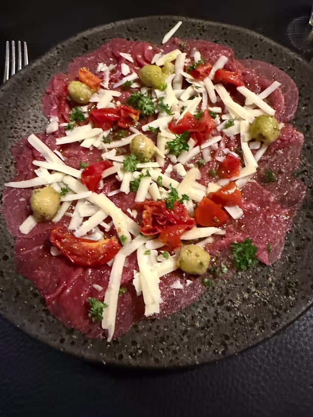 - Beef carpaccio, olives, sun dried tomato, parmesan