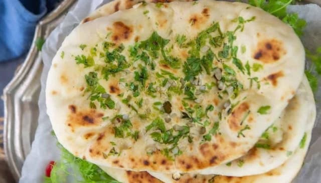 (pão indiano cozinhado no forno indiano (tandoor) recheado com vegetais)