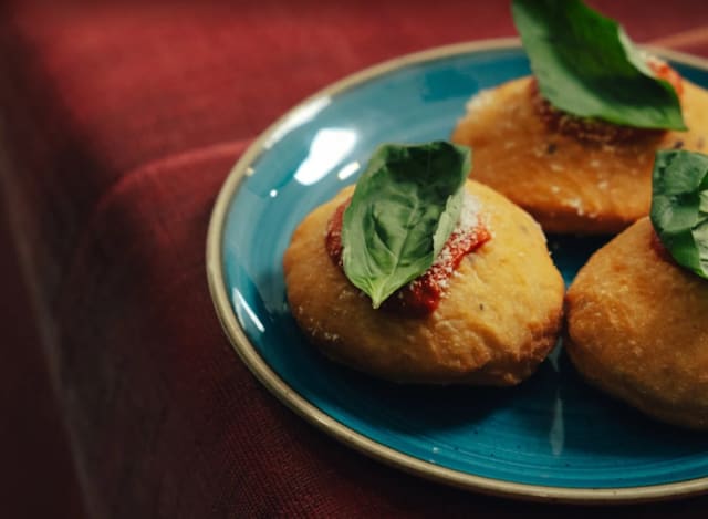 - Pizzette fritte servite con salsa di pomodoro, grana padano DOP e basilico (3 pz.)