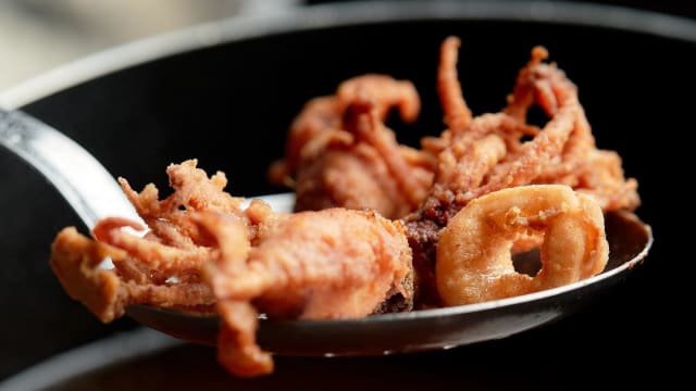Mozzarella di bufala, patè di olive nere, polpo grigliato e friggitielli croccanti